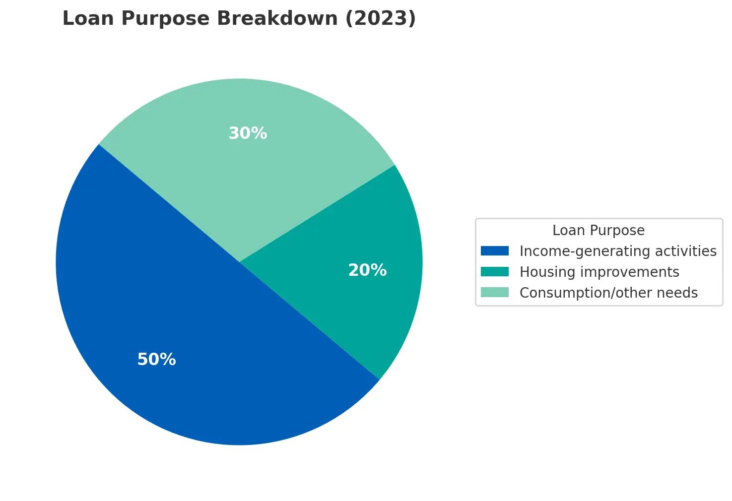 Regarding loan purpose, around 50% of microcredit was directed to income-generating activities, 20% to housing improvements, and the remainder to consumption-related needs.