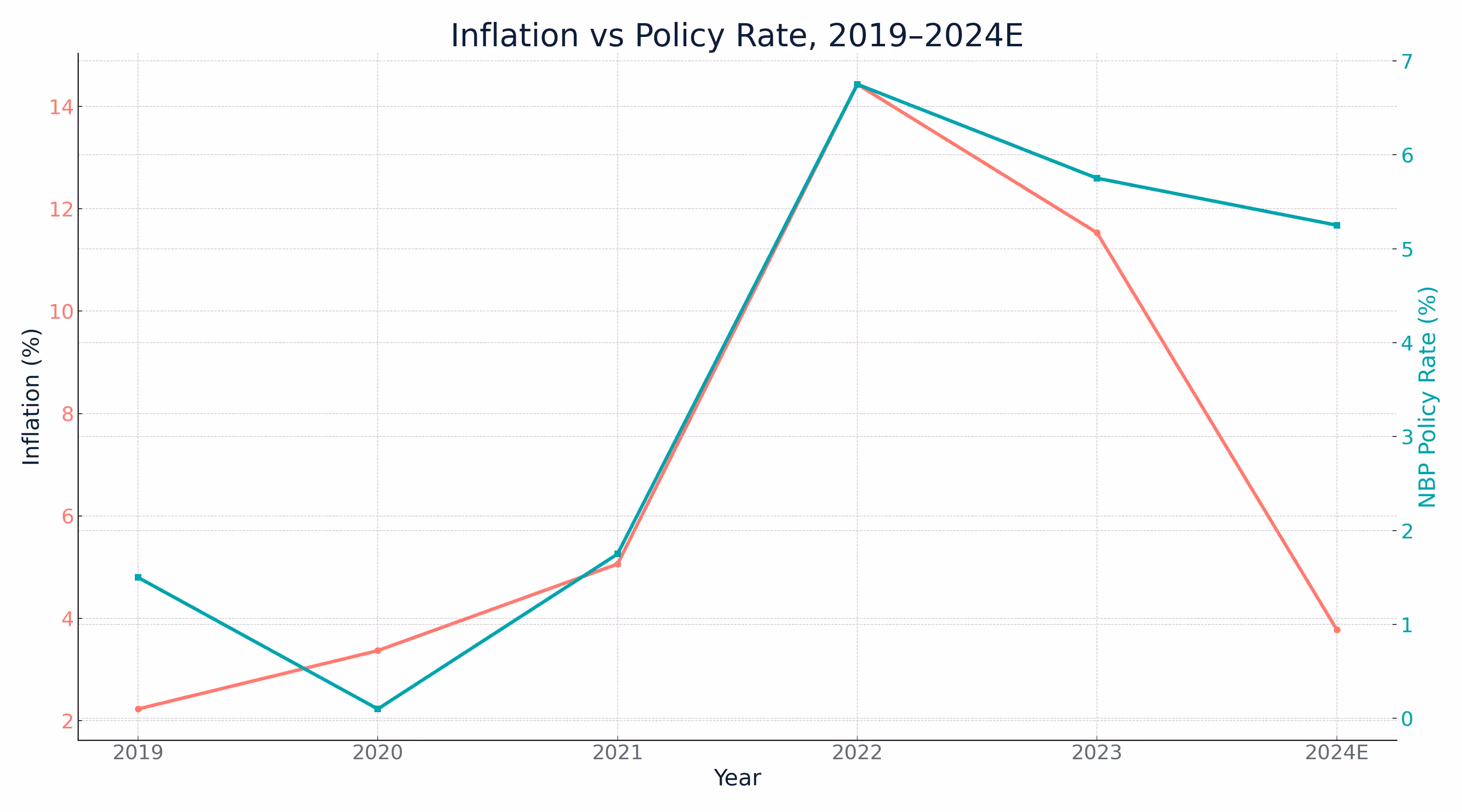 - NBP raised rates from ~0% in 2021 to 6.75% in mid-2022.