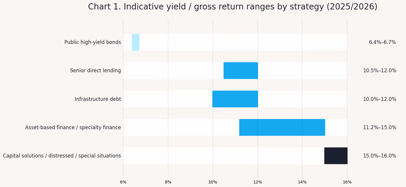 In Chart 1, public high yield refers to the current market yield, while private-credit figures are generally quoted as target returns or recent gross returns. The public-HY comparator here is the ICE BofA U.S. High Yield Index effective yield, which ranged from 6.43% to 6.69% in late January and February 2026. The private-credit ranges combine representative manager disclosures: KKR’s June 2024 market review showed target returns of 10.5%–11.0% for U.S./EU direct lending, 15.0% for ABF, and 15.0%–16.0% for junior debt/capital solutions/distressed; HSBC AM said its infrastructure debt strategy was delivering at the top end of a 10%–12% gross IRR target range; Apollo reported recent gross returns of roughly 11.2%–11.9% in asset-backed finance and 12.0% in direct origination. These are directionally comparable, not apples-to-apples pricing screens 4.
