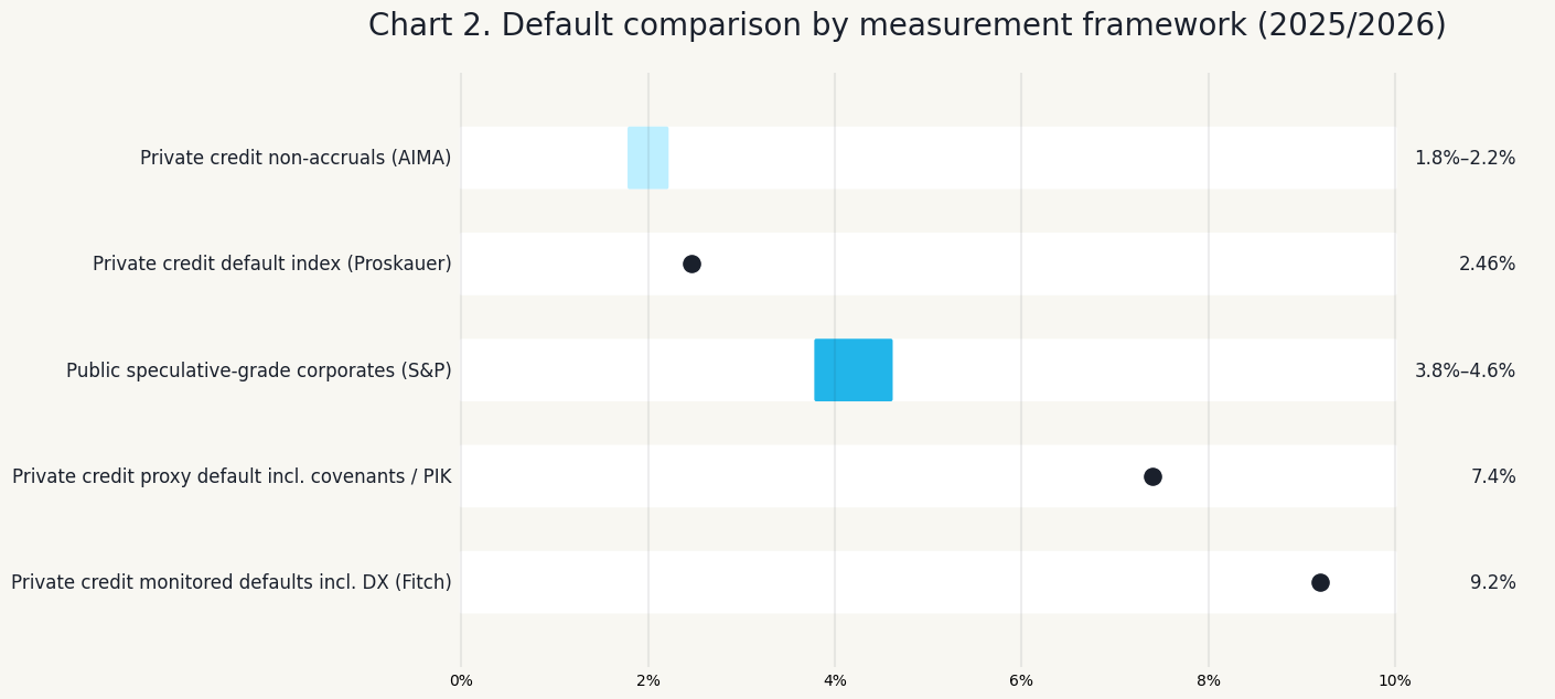 But those low private-credit figures are not the whole story. AIMA itself points to Houlihan Lokey’s 7.4% “proxy default” rate as of September 2025, a measure that includes payment defaults, covenant defaults and amended PIK interest. Fitch’s monitored U.S. private-credit cohort rose again to 9.2% in 2025, and Fitch explicitly included distressed debt exchanges. Europe adds another layer of opacity: Goldman Sachs Asset Management found 150 European credit events since 2017 across roughly $38 billion of LBO financings, but only four were bankruptcies or liquidations; the rest were largely debt-for-equity swaps.